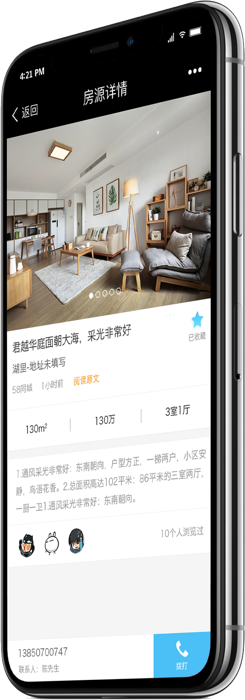房蟻能給你低成本的使用體驗(yàn),只需3秒就能讓它開(kāi)始為你服務(wù)。你無(wú)須下載APP,關(guān)注房蟻微信公眾號(hào)即可。房蟻的每一次房源推送都是一條微信信息,點(diǎn)開(kāi)即可看到房源詳情并撥打業(yè)主電話,每個(gè)人都能輕松自如的使用它。
